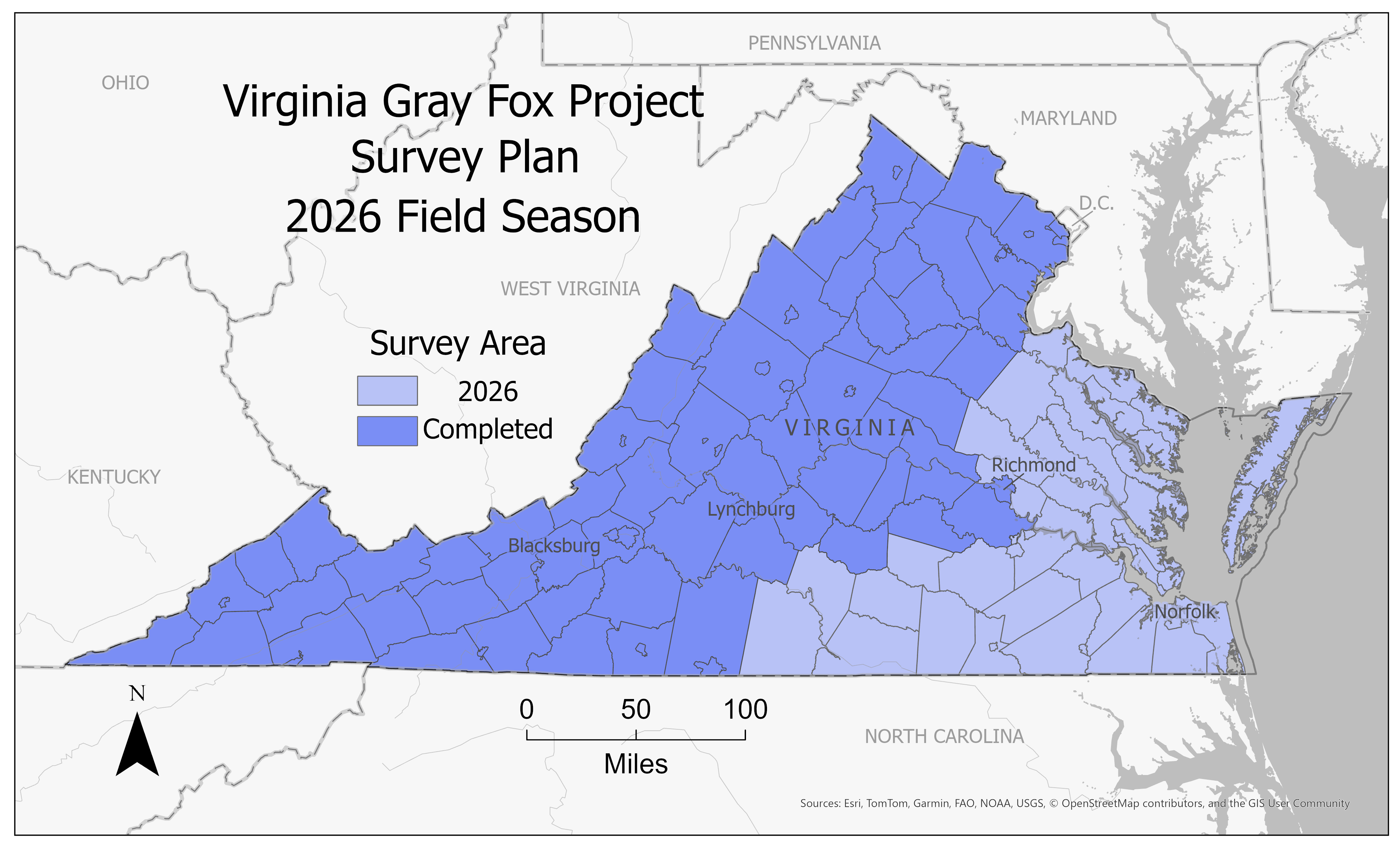If you are interested in participating in the Virginia Gray Fox Project, submit a form. During summer 2024, the focus was on the Appalachian Mountain region (Appalachian Plateau, Valley and Ridge, and Blue Ridge combined); 2025 covered most of the Piedmont, and 2026 will finish the remaining Piedmont and the entire Coastal Plain (including the Eastern Shore).