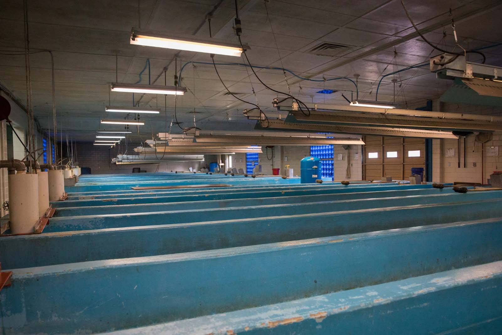 Built and placed into service in 1964 by the U.S. Fish and Wildlife Service, the hatchery was transferred to the Virginia Department of Wildlife Resources (DWR) in 1983. Two deep, underground upwelling aquifers, both of which are located on the 100-acre DWR property surrounding the hatchery complex, supply source water for the facility. Both water sources are high-quality, high-flow limestone spring water with an almost constant temperature of 55°F year-round. Flows to the facility remain fairly consistent over the long term at an average of 2,400 gallons per minute.