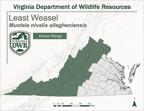 The Least Weasel is native throughout the western portion of Virginia, with the Blue Ridge generally defining the eastern edge of its range.