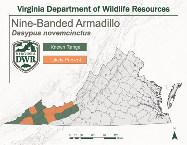 The Virginia Department of Wildlife Resources is actively seeking reports of Armadillos from within the Commonwealth. If you have any verifiable information (i.e., photos, video, etc.) regarding the occurrence of Armadillos in Virginia, please enter your information using Virginia DWR’s Rare Animal Observation Form by tapping here.