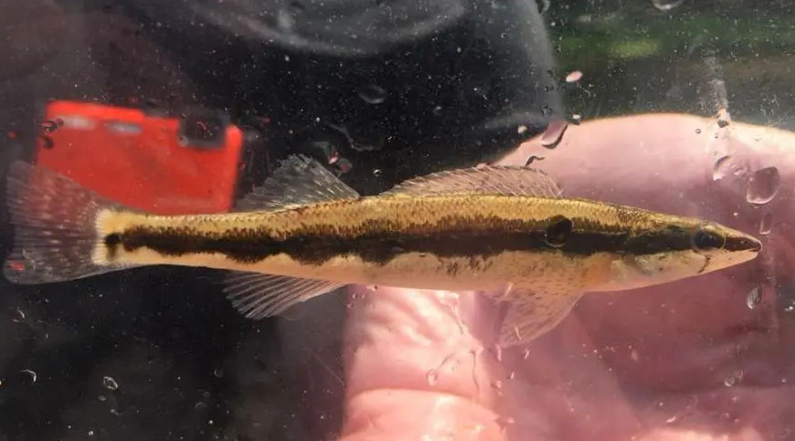 Fisheries Biologists use a small aquarium to safely view a Sickle Darter. Photo by ©University of Tennessee - Institute of Agriculture